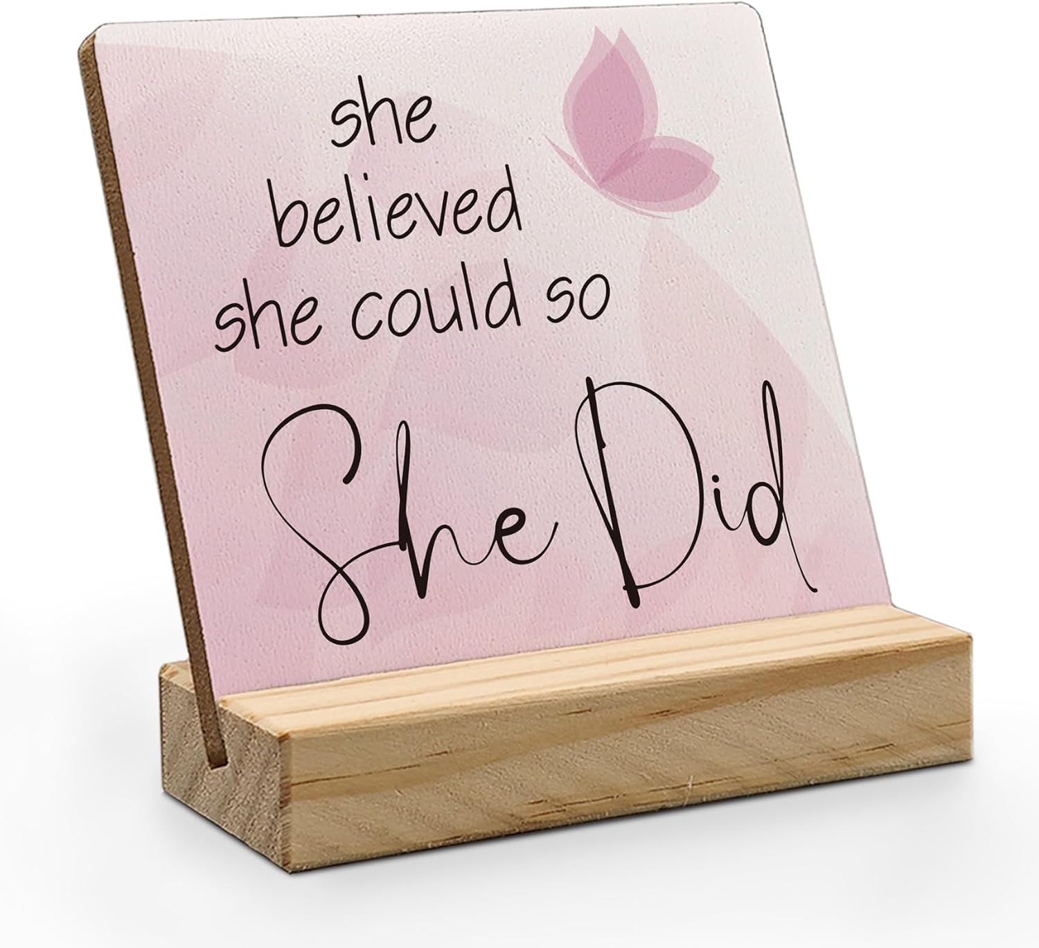 Inspirational Desk Decor, Motivational Quote Wood Plaque, Inspirational Positive Gifts for Women,Pink She Believed She Could So She Did Wooden Plaque Sign with Wood Stand for Home Office Decor